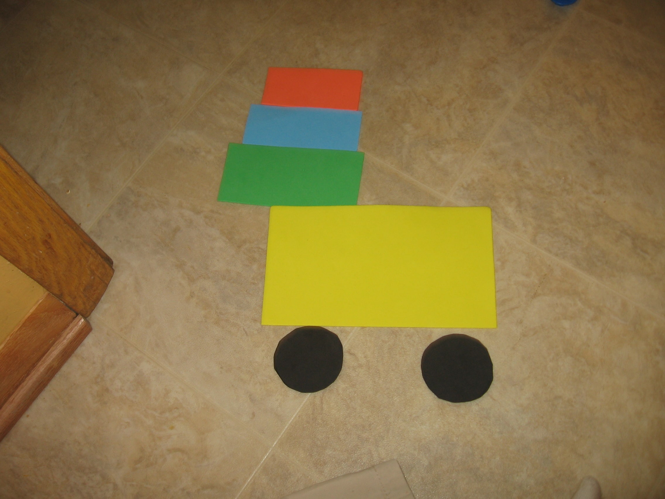 我剪掉了一堆泡沫形状 - 方块,三角形,矩形和黑色圆圈。然后我给了我的两个小套,让他创造一辆卡车或火车。他玩得开心。我见过很多博主会让泡沫形状有点湿,以便他们的孩子可以在窗户或浴缸墙上创造。他们坚持魔法!