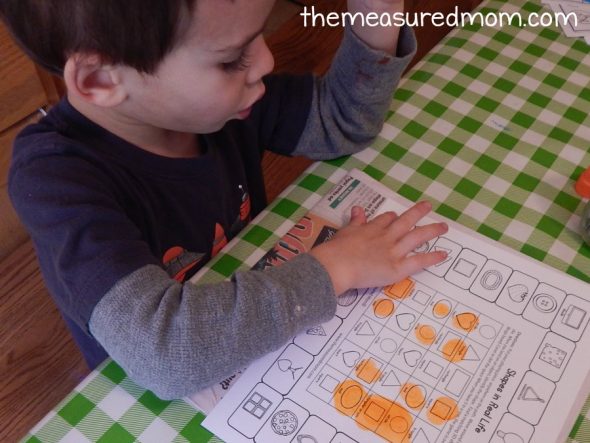 当他停在一张图片上,他识别出它的三维形状,然后用一个点在黑板上相应的形状上Do-a-Dot标记.如果您不喜欢使用点标记,您的学生可以给形状上色或使用一个小的操作覆盖它们。