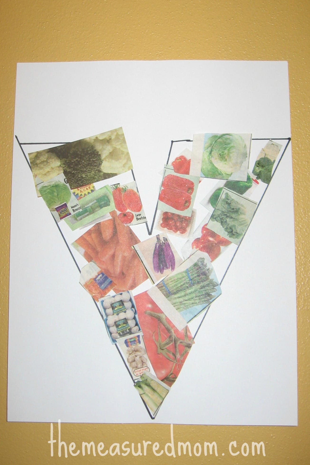 这是一个超级简单的手工,用于字母V.拿出你的杂货店广告,并与你的小家伙一起制作一个字母V的蔬菜拼贴画。