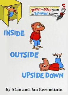 你还记得你童年的这本书吗?这是我的最爱之一。这是一个非常短的故事(只是每页或两个短语)关于爬进空盒子的熊。他的父亲错误地将其装载到卡车的背面,我们看到年轻的熊的行程“内部,外面,颠倒”。