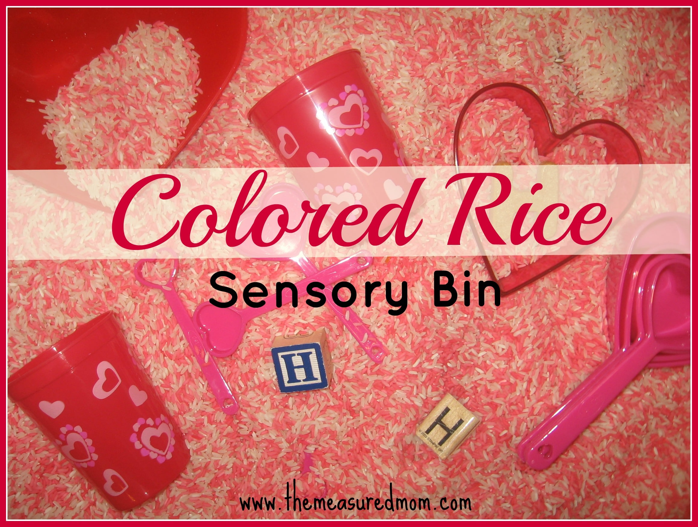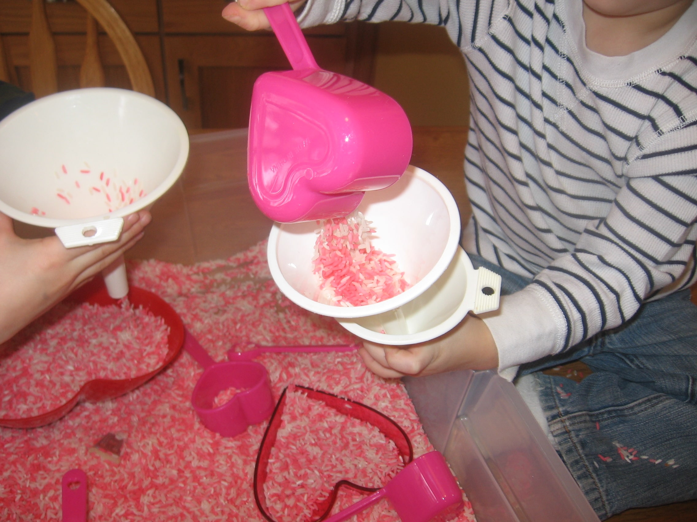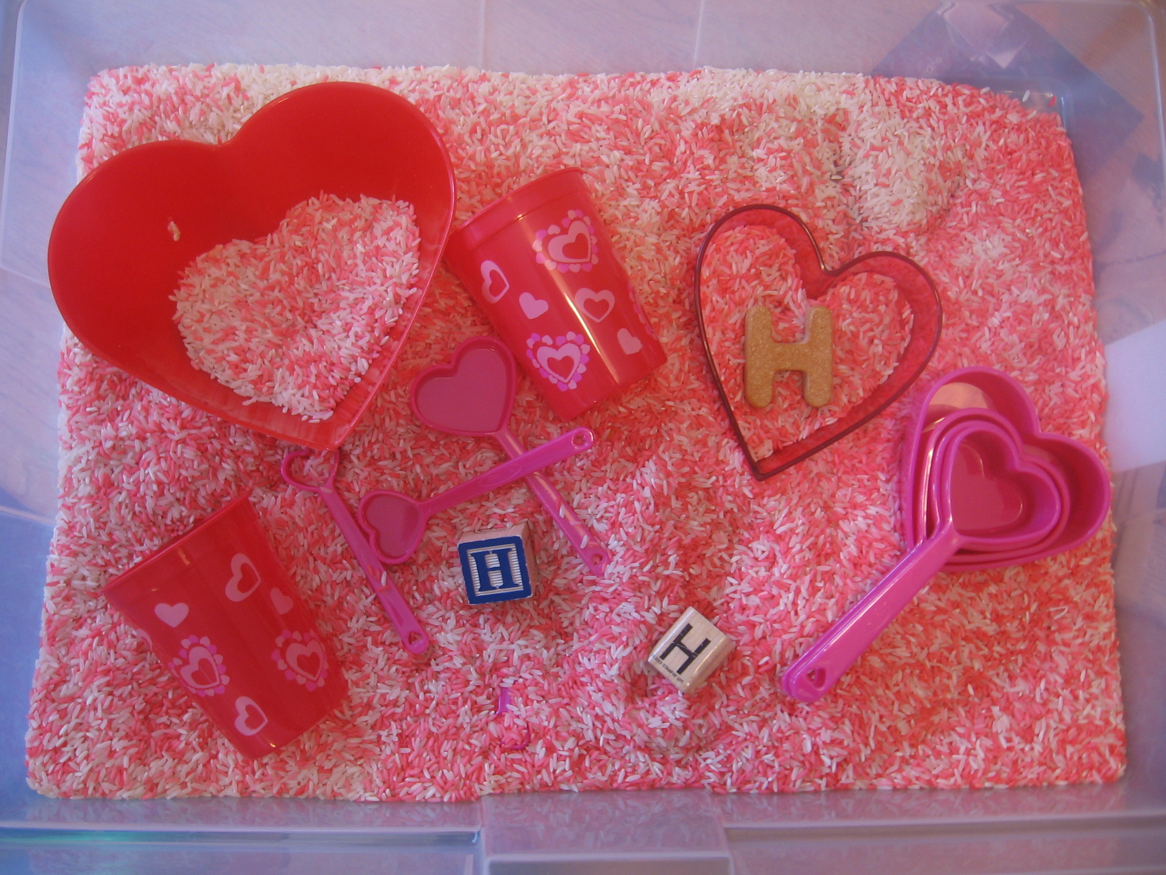 在一些白米混合后,我添加了一些东西可以玩。我在美元商店买了一些心脏杯子,在目标的一些心形碗,以及来自目标美元箱的一些心形测量勺子。我们扔了几个字母“H'”,男孩们很高兴去。