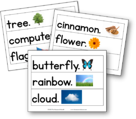 他毫不费力地找到了“我”和“能”这两个词。他当然知道字母I(多亏了我们的)每周信件课程!),可以通过/k/找到“can”。我帮他找到了其他的词。他选择把哪张图画卡放在每个句子的末尾。