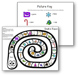轮流滚动骰子和移动你的棋子周围的蛇。当你看到一张照片时,说出它的名字。然后在你的纸上拼写出来。图片是一个简短的单词(如蝙蝠那平底锅,帽)或a-e字(如蛇那蛋糕,葡萄)。