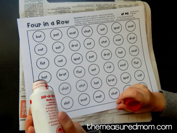 我们从“at”板开始,因为这是一个他非常熟悉的词族。因为整个棋盘上的字都是以在,你的孩子得到大量的练习,一遍又一遍地阅读相同的单词。让我们为自动性喝彩!