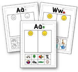 首先,让我解释我在活动页面背后的推理。我抱着他们超级简单的.每页只关注听一个字母的发音。有八幅画。学习者将以字母开头的四张图片粘在笑脸下面。他们把四个不以字母发音开头的字母粘在悲伤的脸上。