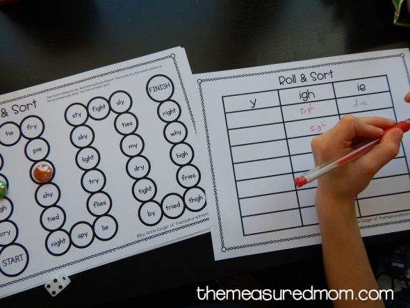 在这个游戏中,学生需要注意每个单词的拼写模式。而不是滚动骰子沿着路径移动,他们滚动骰子并检查游戏顶部的关键,并移动到最接近的单词拼写模式。