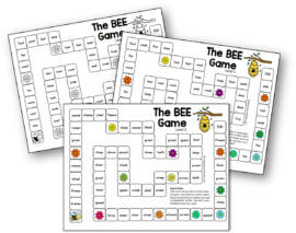 轮流滚动模具,并在董事会上移动,将你的蜜蜂带到蜂巢中。如果你登陆一个词,大声朗读。如果你落在一朵花上,你会失去一圈。因为停下来喝一些花蜜需要一段时间。