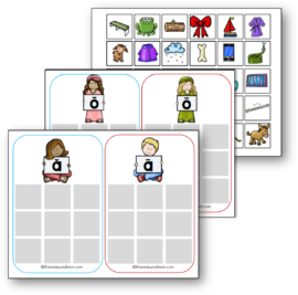 我开始了,让我的四人做一个简单的排序:他为短暂的A和短o分类了图片。他已经知道这些字母的声音,但如果您的孩子需要帮助您可以将每张垫子作为线索放下第一张照片。