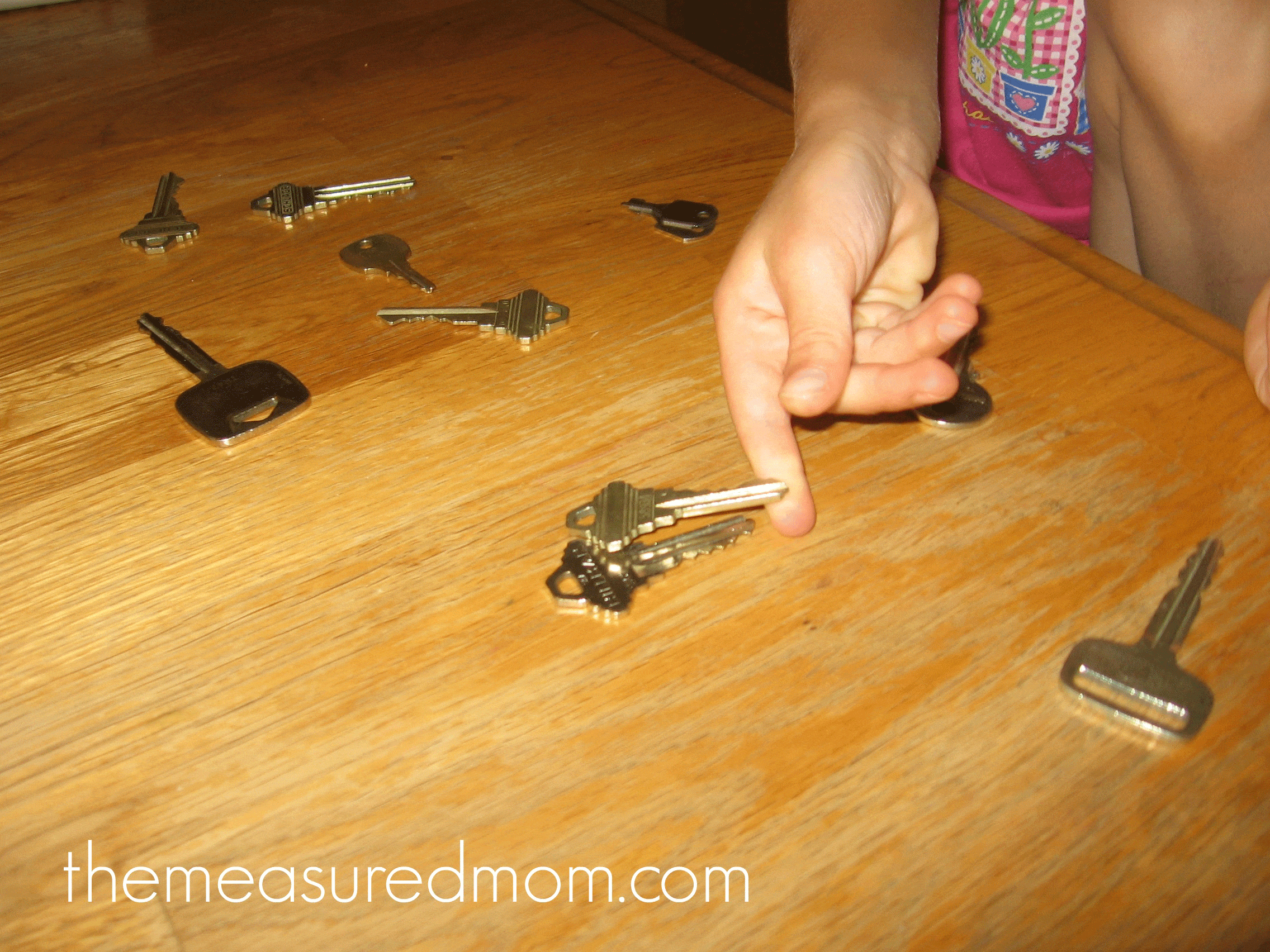 出去一些旧钥匙或只是清空你的钥匙圈。让您的学龄前儿童选择如何对其进行排序。她可以按尺寸,形状,孔等。
