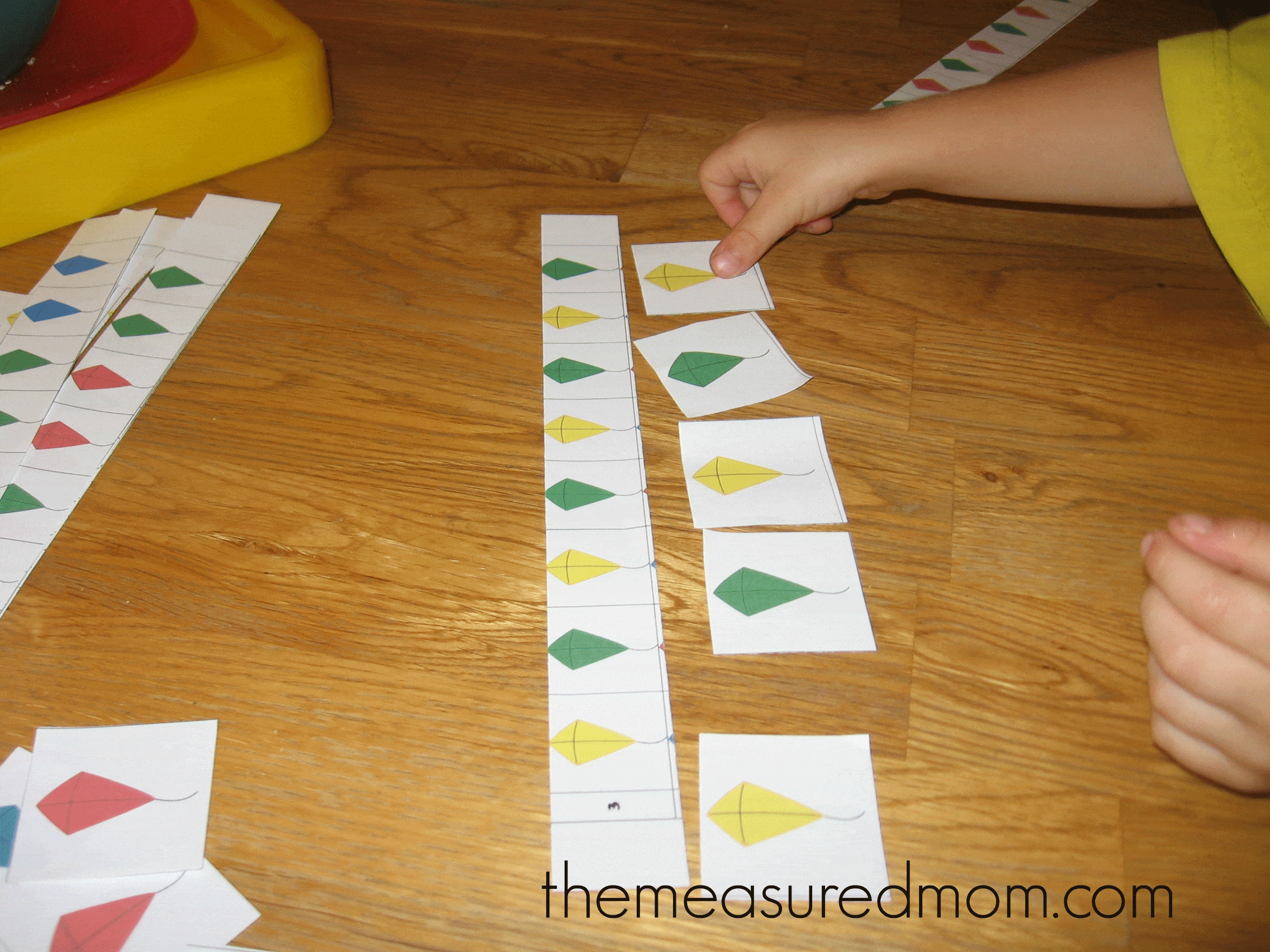 我印刷了这些图案条,给了我三个五颜六色的风筝正方形。我们一起努力匹配模式。即使是简单的ABAB模式的想法也没有“点击”他,所以这是一个很好的介绍。如果您的小人物没有准备好完成自己的模式,我建议这种活动。