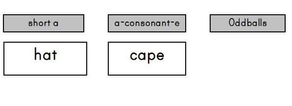 它可以这样发音:“你知道字母a有不同的发音。有时它发出短的声音,有时它发出长的声音。当a发出不同的声音时,我们拼写单词的方式就不同。今天我们要对短a和a-辅音-e的单词进行排序。你也会发现一些不遵循这两种模式的单词。我们称他们为怪胎。这是我们的第一个标题词:帽子.那个声音是短的还是长的?我们应该把它放在哪里?这是我们的另一个头文件:角.你能告诉我这个要放在哪里吗?”