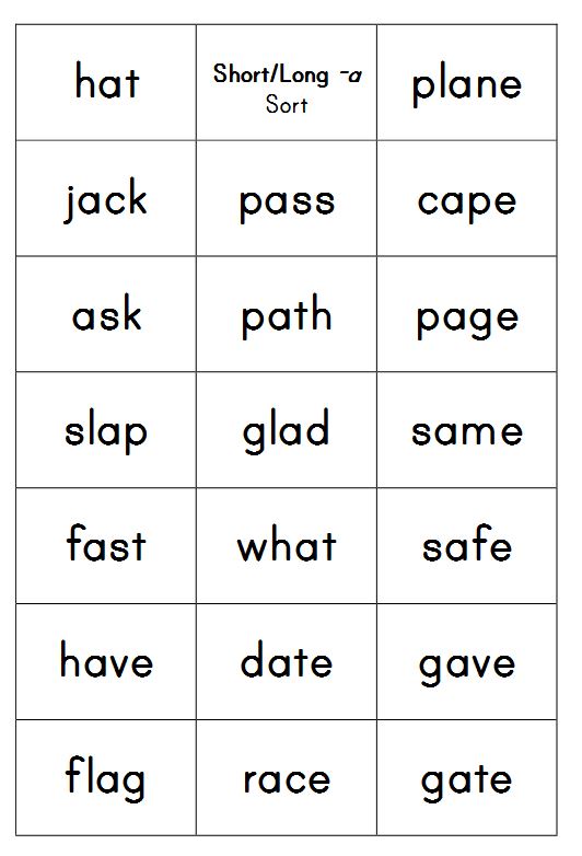 1)教师指导的封闭排序(如上所述):您定义类别,建模排序,然后让您的孩子完成它。(这种分类适用于短单词和长a-辅音-e单词。我要开始了帽子和角.我的下一个词是很高兴.它会在下面的一栏里帽子.你能完成排序吗?)