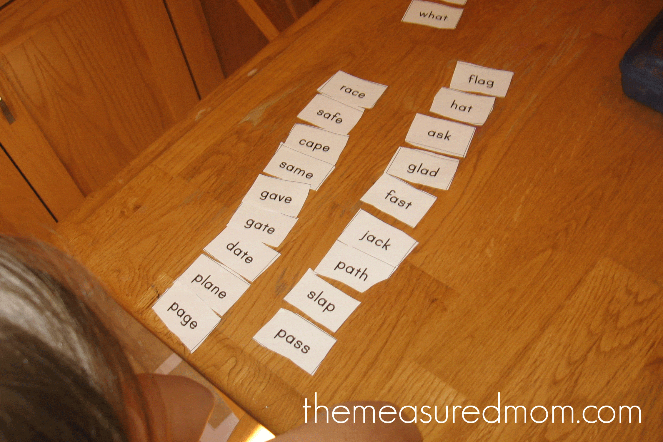 还有一个更复杂的概括——我女儿听不懂——听起来是这样的:“当你听到一个单音节单词中的一个短音时,在辅音之间只用一个A。当你在一个单音节单词中听到一个很长的音时,把它拼写成a-辅音-e。”
