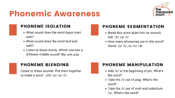 谈到音素意识时,有很多不同的碎片,所以我为所有四个部分的音素意识提供了整个幻灯片。首先,我们可以从音素隔离开始,当您谈论第一个音素时,这是一个很像声明。你可以说,“河马这个词开始了什么?”鸟“这个词结束了什么声音?”或者你可以让他们倾听这些词语并告诉你哪一个是不同的,“听这些单词,哪一个有一个不同的中音,'rip','win','pop'?”