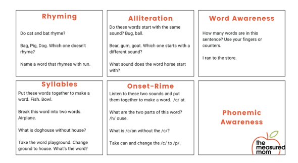 好吧,所以我会给你一些口头活动,你可以为那些楼梯的每个技能做。首先,让我们从押韵开始。你走得非常基本,如果两个单词押韵,那么你可以获得更高级的。这是你能做的三件事。“做'猫'和'蝙蝠'押韵?”你可以做一个奇怪的一个,“'袋子','猪','狗',哪一个不是押韵?”或者你可以让他们生成押韵,你可以说“用'运行'命名一个押韵的词。”