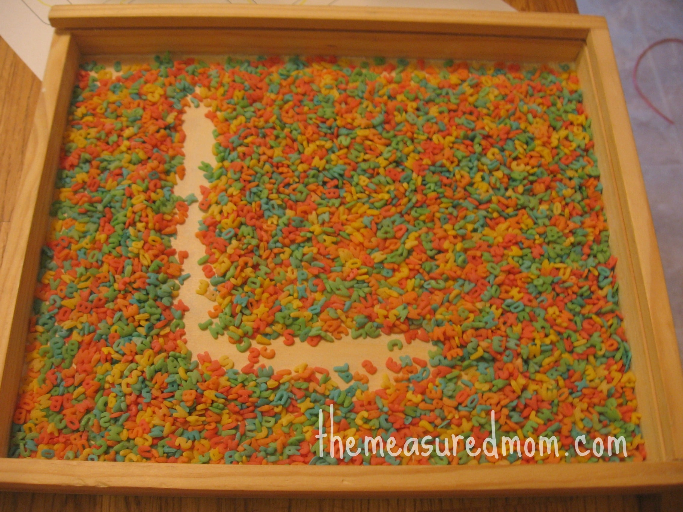 我倒了一些彩色字母意面(阅读我们的“L是字母”感官箱)在这里),男孩们用手指写了一个“L”。