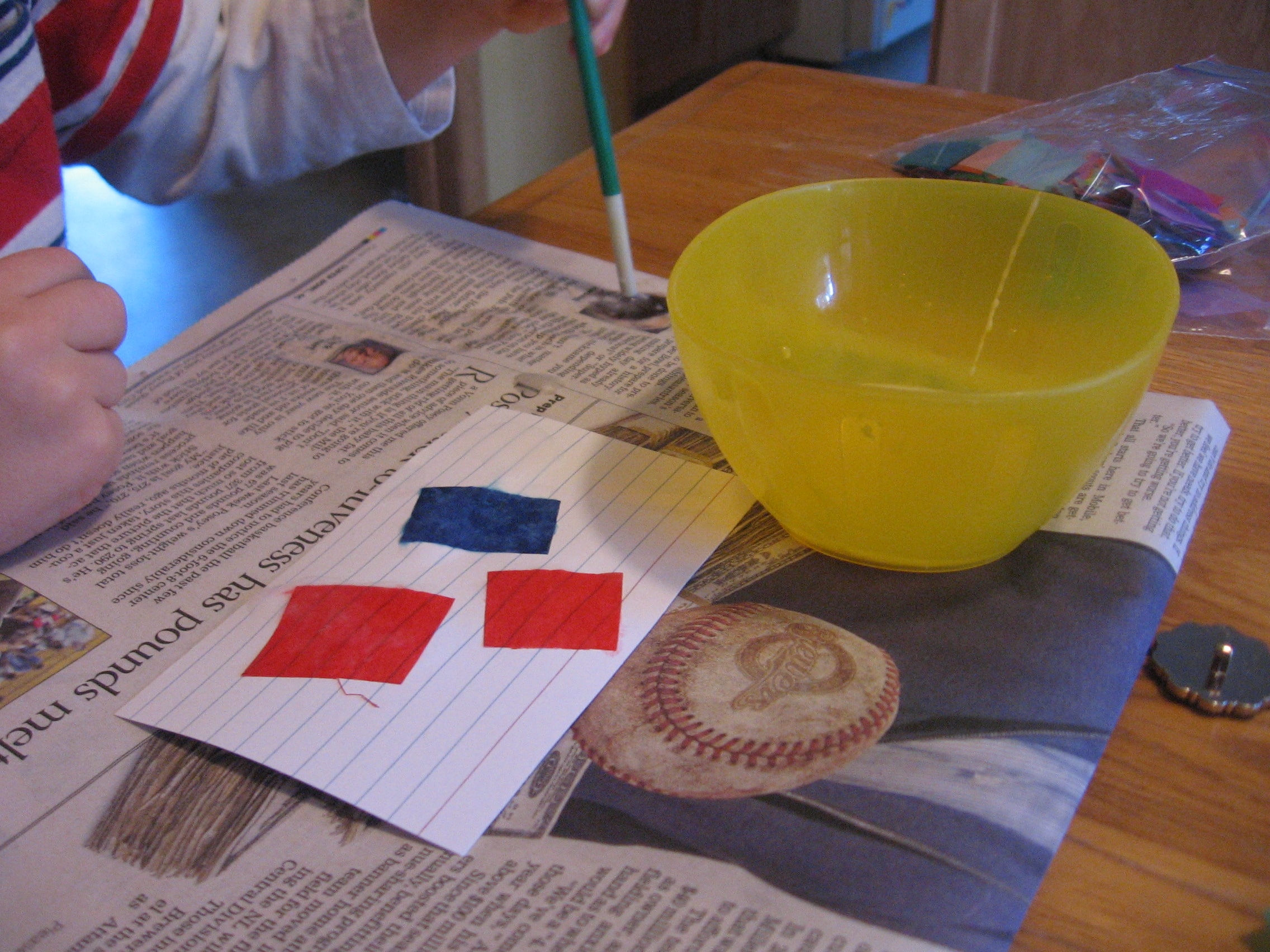 我们从活动村.我四岁的儿子刷盘子(颜色是他选的)。第二天,我剪下了其他的碎片让他粘上。