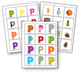 我印刷了我们的字母P图片卡(在这篇文章结束时获取它们)并命名每张图片。当我命名它时,我的女儿用扑克筹码覆盖了每一个。之后,我让她命名每张照片并覆盖每个剧本她命名它。