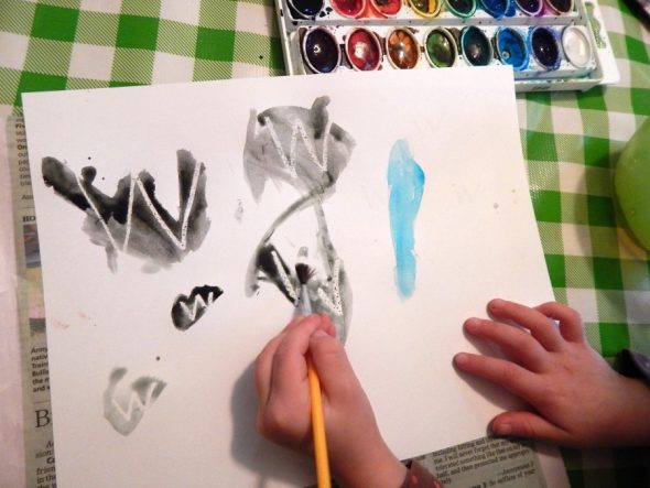 这是另一个有趣的水彩活动。我用白色蜡笔在一块卡片上写下了这封信。然后我的女儿通过在页面上绘制来为他们追捕。她喜欢这个!