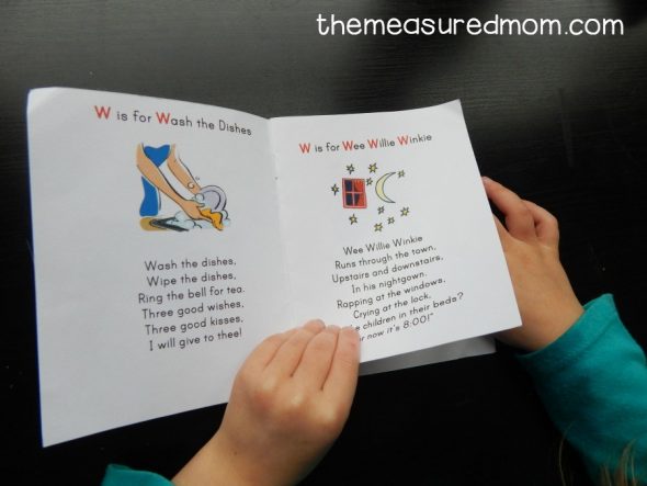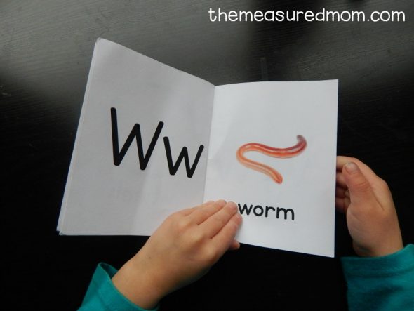 这是我们的免费字母书籍.我喜欢听她给所有的图片取名字!“Wehm。”
