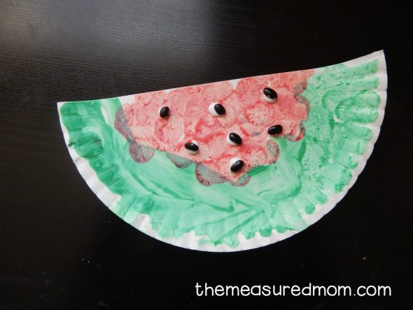 最后,我们使用Do-a-Dot标记和干黑豆做这个纸盘西瓜。