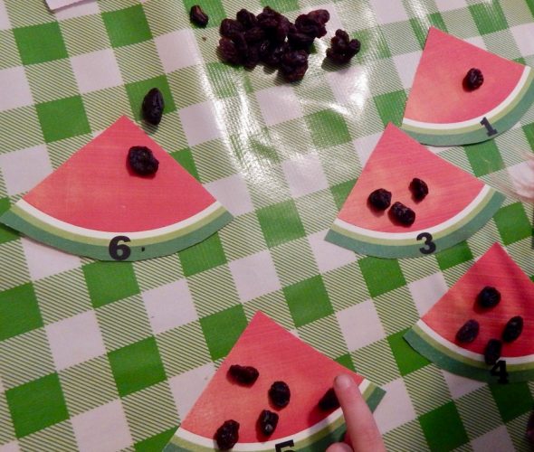 我们尝试了这些西瓜计算我下载的垫子从ABC到ACTs.我帮女儿数每个垫子上的葡萄干,她能认出1-6中的一半数字。她需要别人帮她数高于3组的葡萄干。