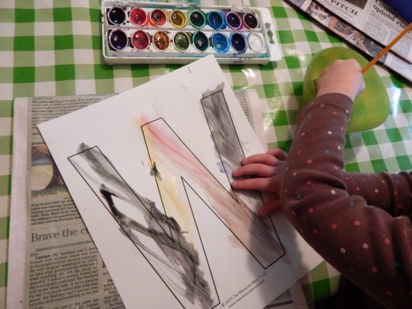 我印花A.印刷体字母L,我女儿用水彩给它上色。