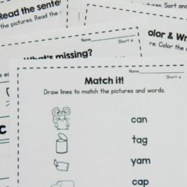 这就是为什么我创建了我的第一套牛奶帽拼写垫简称a.我休息了一段时间,创造了一些其他的材料来练习自然发音——比如我的阅读粘垫和字家庭的房子.