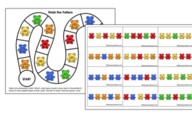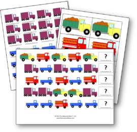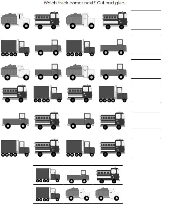 我包的最后一部分是这两张作业表,可以在家里或在教室里使用。我把它们做成了灰度,以便打印和复印。第1级工作表是ABAB模式。“我的四”完成图案没有任何困难,但他需要有人帮他把这页纸底部的卡车剪下来。