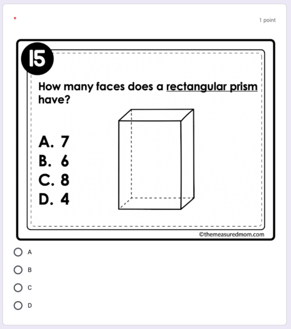 学生将阅读每个问题并确定每个幻灯片上的答案。它们将识别3D形状和计数面,边缘和顶点。