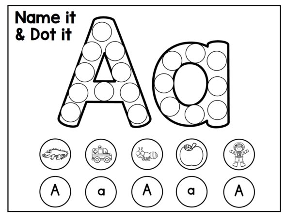 让学生使用DO-A-DOT标记,因为它们点缀了字母,名称图片,并将页面底部的大写和小写字母命名。