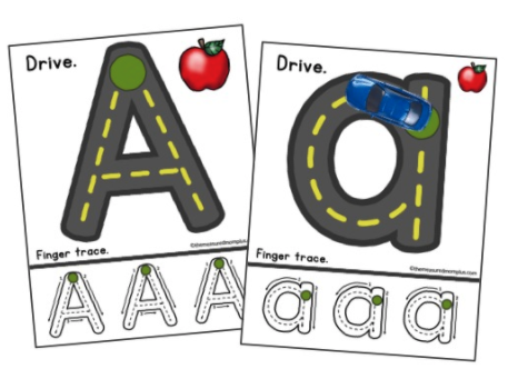 通过使用玩具车骑在路上,向您的学习者展示如何在每个大信上“开车”。还向他们展示了如何手指跟踪每个页面底部的字母。