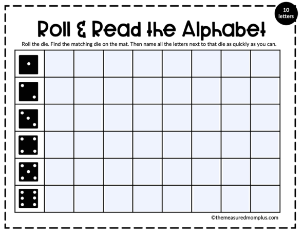 输入您希望学生练习认可和命名的字母。从三个不同的垫子中选择(一个包括10个不同的重复字母,一个包括18个总字母,第三个垫包括所有26)。