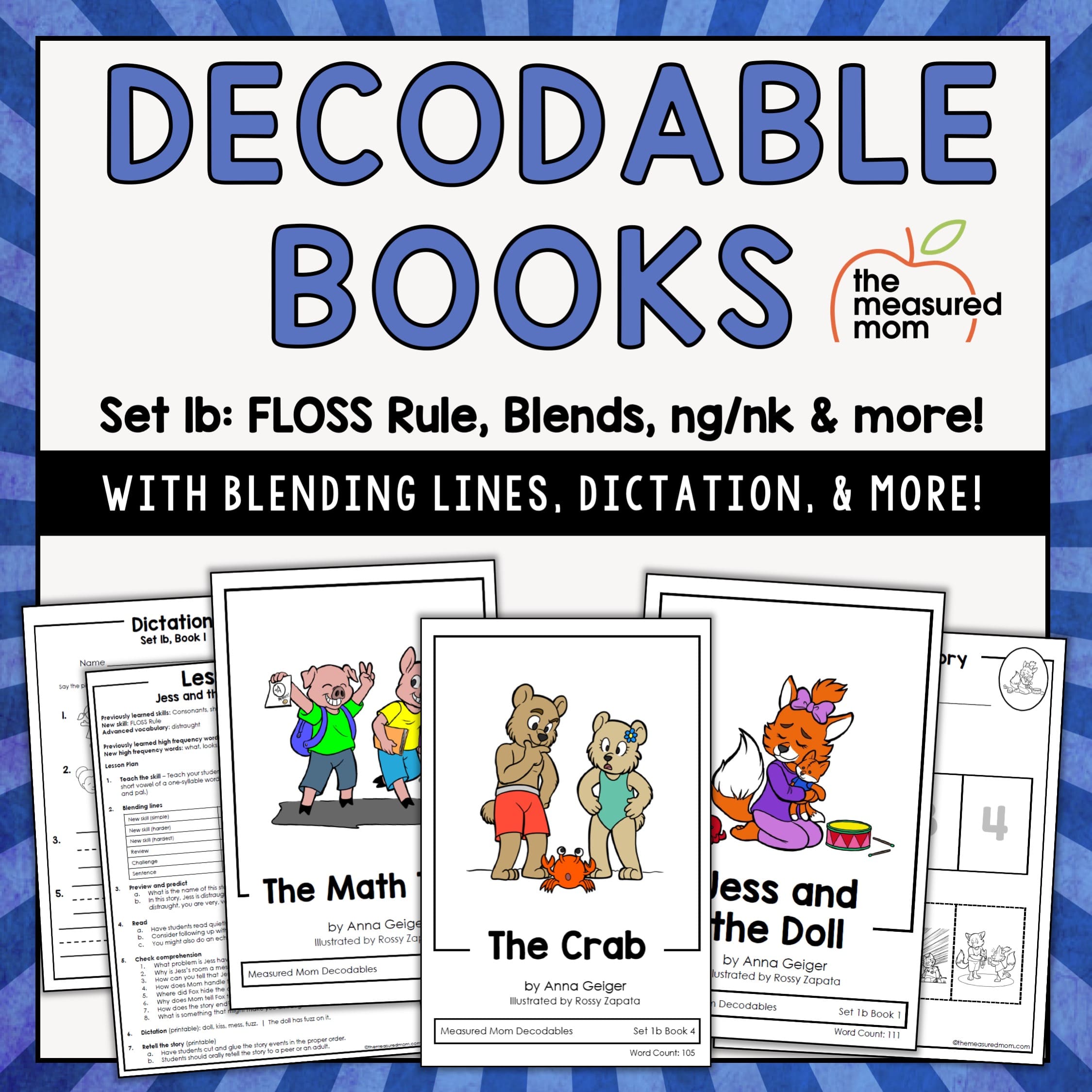 在第1b组中,随着这些技能的介绍,书的难度在不断提高:FLOSS规则,简单的复合词,l- mixers, r- mixers, s- mixers,最终的mixers, -ng, -nk,带有-ild, -old, -ind, -olt和ost的单词,以及开放音节单词。