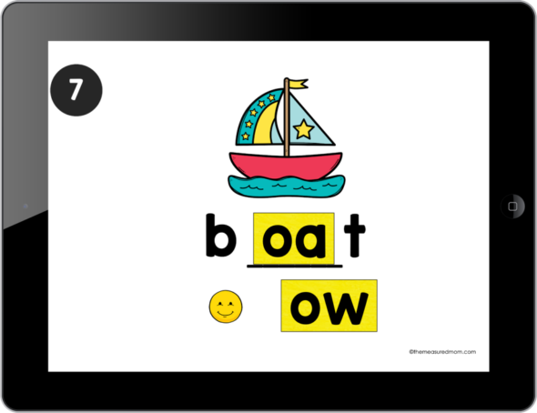 学生将辨认图片并移动元音组(oa或ow)来完成单词。幻灯片在自我检查。