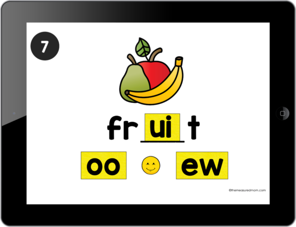 学生将识别图片并移动元音组(oo, ui,或ew)来完成单词。幻灯片在自我检查。