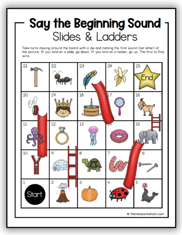 使用这个游戏来帮助学生识别开头的声音(而不是字母)。当他们在一幅画上着陆时,他们会给它命名,并给它的开始声音命名。