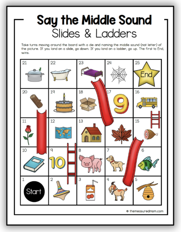 使用这个游戏来帮助学生学习识别中间音(不是字母)。当它们落在一幅画上时,它们会给它命名,并发出中间的声音。