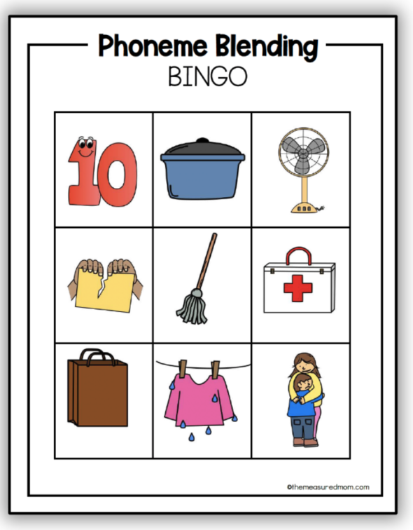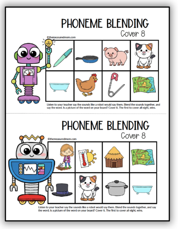 使用这个游戏来帮助学习者混合音素。说出每张电话卡上的声音。学生将声音混合在一起,盖住黑板上的匹配图片。