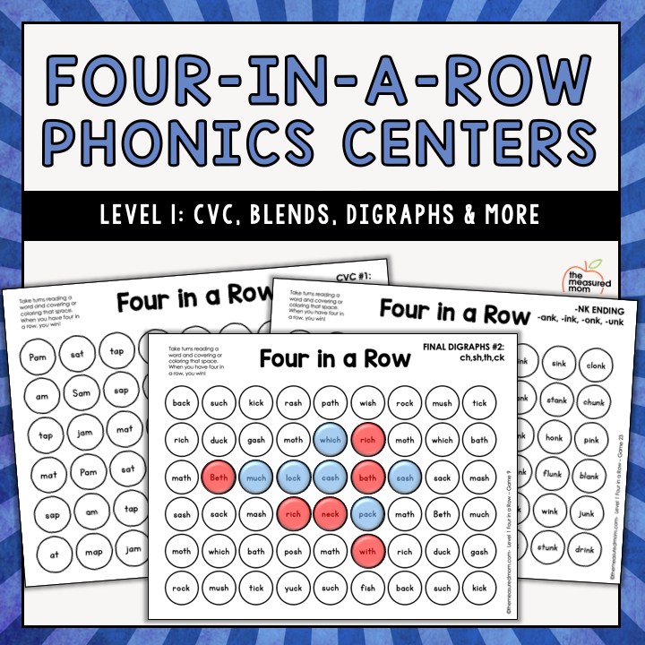 我们的四进一排游戏是一种简单的、无需准备的方法来提高解码技能。孩子们喜欢他们!