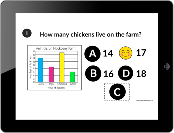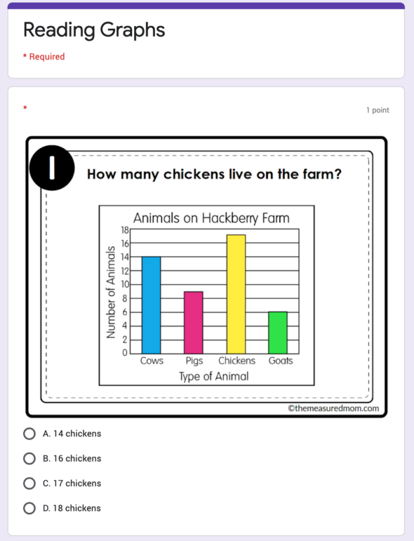 学生阅读每个问题,并通过条形图或图片来决定答案。他们也可以在谷歌表单中以测验形式进行活动。