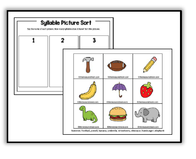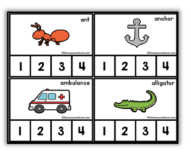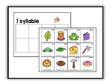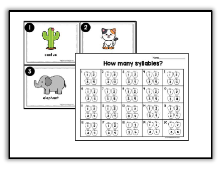 打印剪贴卡片并放置在中心。学生们用夹衣夹来展示每张图片的名字有多少个音节。