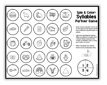 学生们用回形针和铅笔旋转数字。然后他们在网格中涂上一幅有这么多音节的图片。第一个连得三分的人获胜。