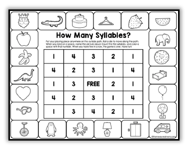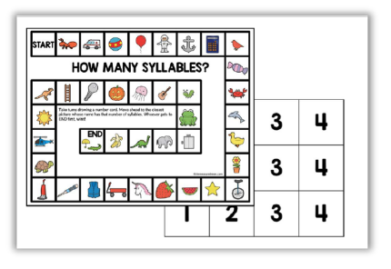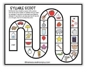 你会喜欢的,学生可以自己玩这个游戏!他们用骰子在游戏的边界上移动一个棋子,并涂上数字来表示每张图片有多少个音节。