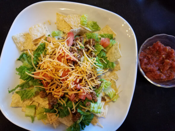 - 墨西哥煎玉米卷沙拉。用炸玉米饼肉,切碎的辣椒和/或西红柿,奶酪,黑豆和/或玉米酱。配薯条和酸奶油。