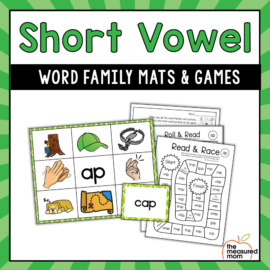 这是一套35个可打印的短元音单词家庭图片垫,带有相应的单词卡。这些垫子有三种不同的版本——有边框的全彩、无边框的彩色和黑白。每个垫子还配有一张工作表和两个游戏。