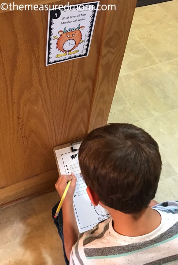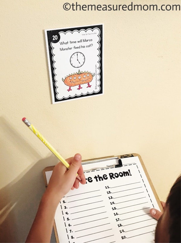 让你的学习者在房间里移动并阅读每张卡片。它们应该确定时钟上的时间是什么时间并将其记录在记录纸上的适当位置。