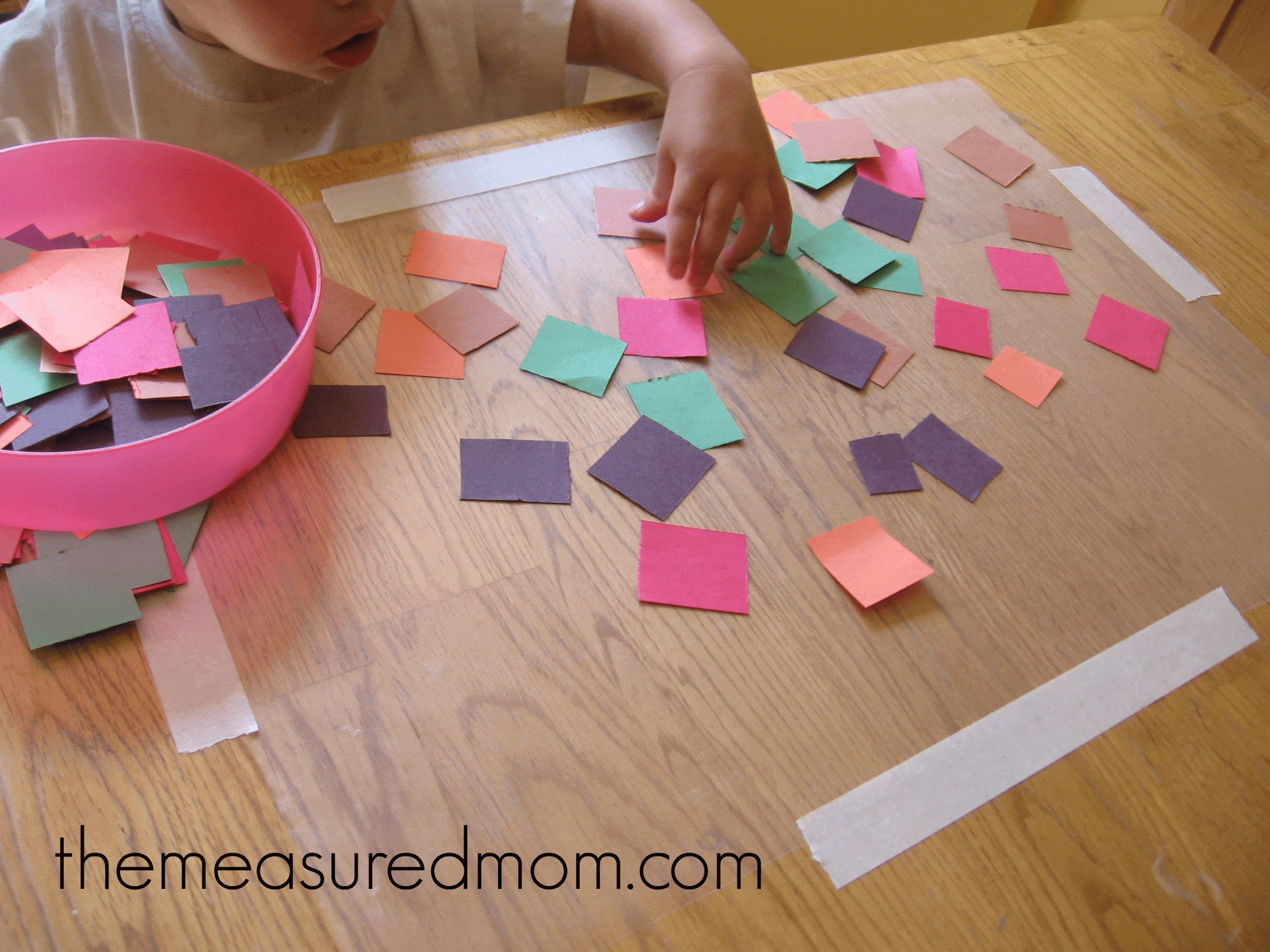 我爱明确接触纸.如果你把背面剥下来,用胶带(有粘性的一面)粘在桌子上向上),您为您的小孩提供了一个有趣的工作面。给他一堆建筑造纸方块,告诉他如何把它们贴在纸上。大约十分钟后耐心地将正方形贴在接触纸上,我的小孩把它们全部拿走了从再次并将它们放回碗中。一个伟大的第一个工艺,他可以自己完成所有!