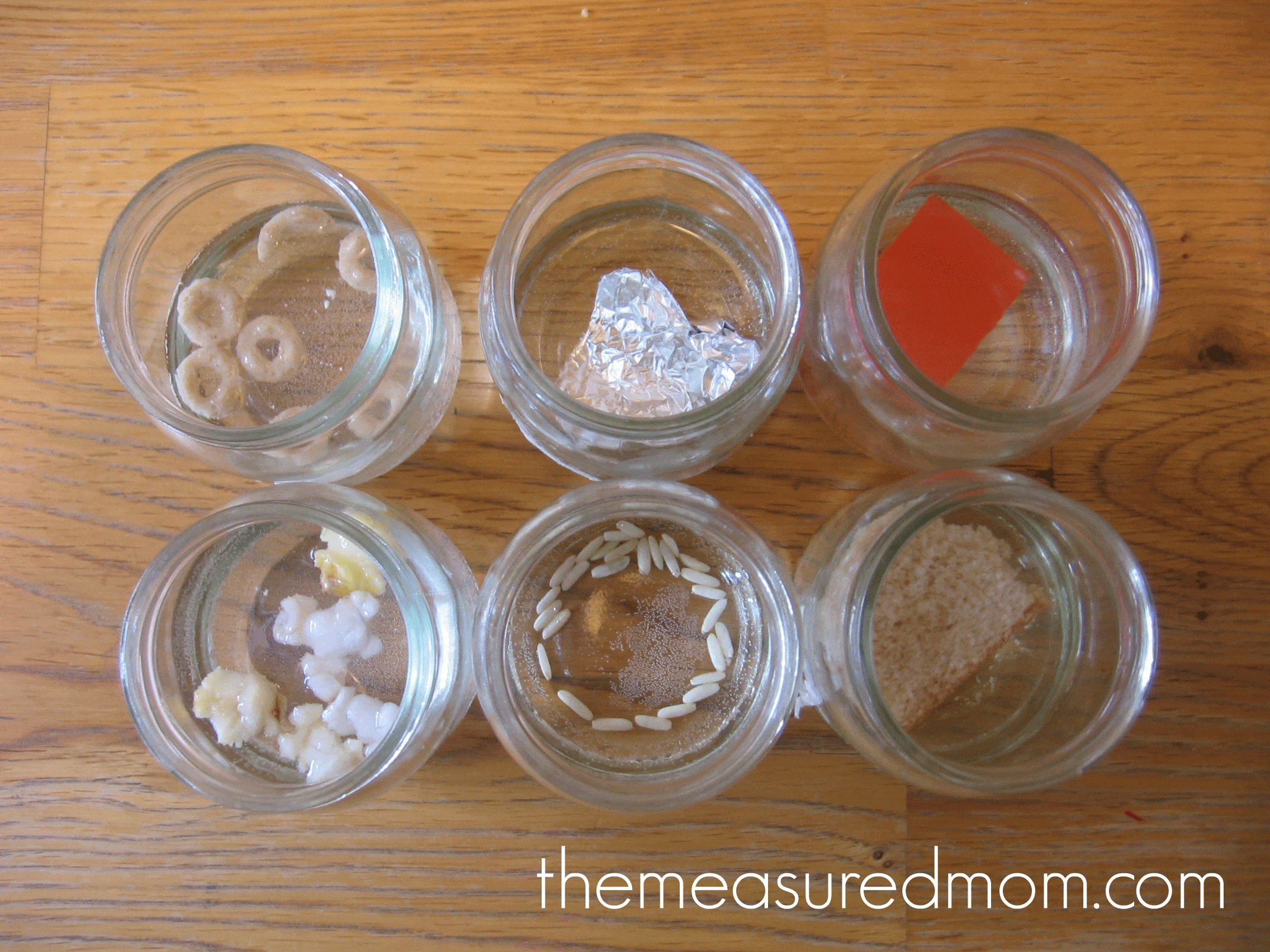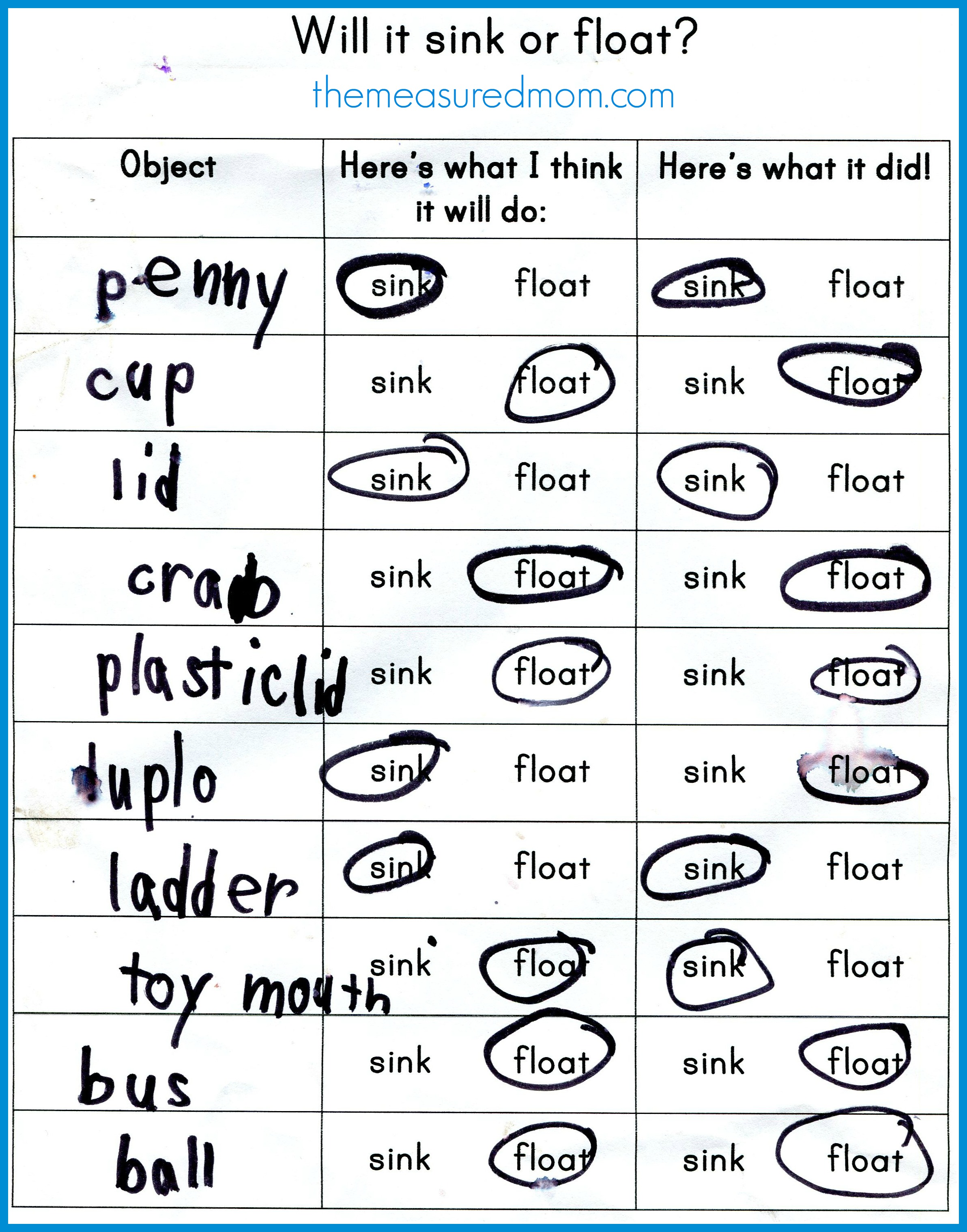“我会得到一分钱,妈妈!我知道他们下沉了。“她很高兴在录音表上编写每个对象的名称。孩子们轮流选择一个物体,预测它是否会沉没或浮动(我的女儿记录的),然后测试他们的假设。