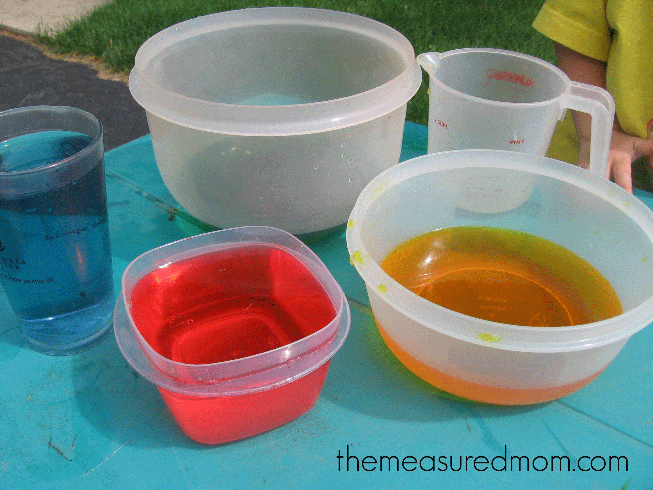 我填满了各种塑料容器,每个塑料容器都有2杯水。然后我把它们带到外面,让孩子们向每个人添加食物着色(当然,他们喜欢这一切)。接下来,我让他们告诉我他们认为哪个容器持有最多水。您可能已经猜到了他们的顶级猜测是一杯蓝色水和红水的容器 - 因为水被填充到顶部。我们轮流将水倒入测量杯中。他们惊讶地发现每个容器持有完全相同的数量。